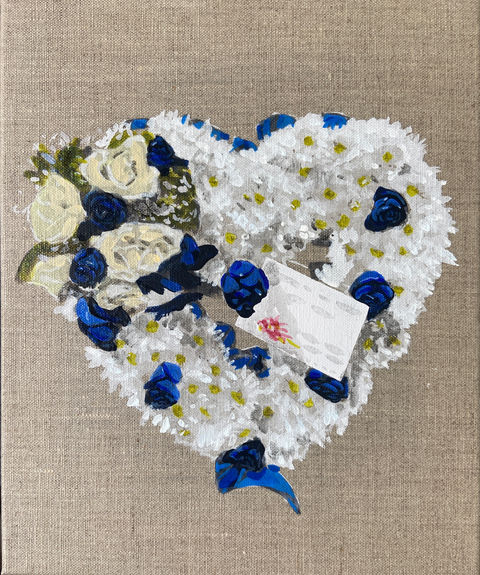 These works are an ongoing series of works showing anonymous floral tributes. Removed from their identifying landscape and referencing memento mori, vanitas painting, floriography and still life tradition, these paintings are quiet contemporary reflections on loss, memorial and love.